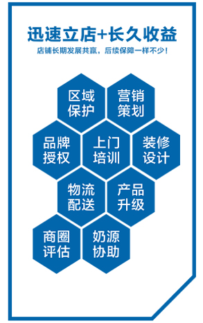 品牌授权,上门培训,装修设计,物流配送,产品升级,商圈评估,奶源协助。